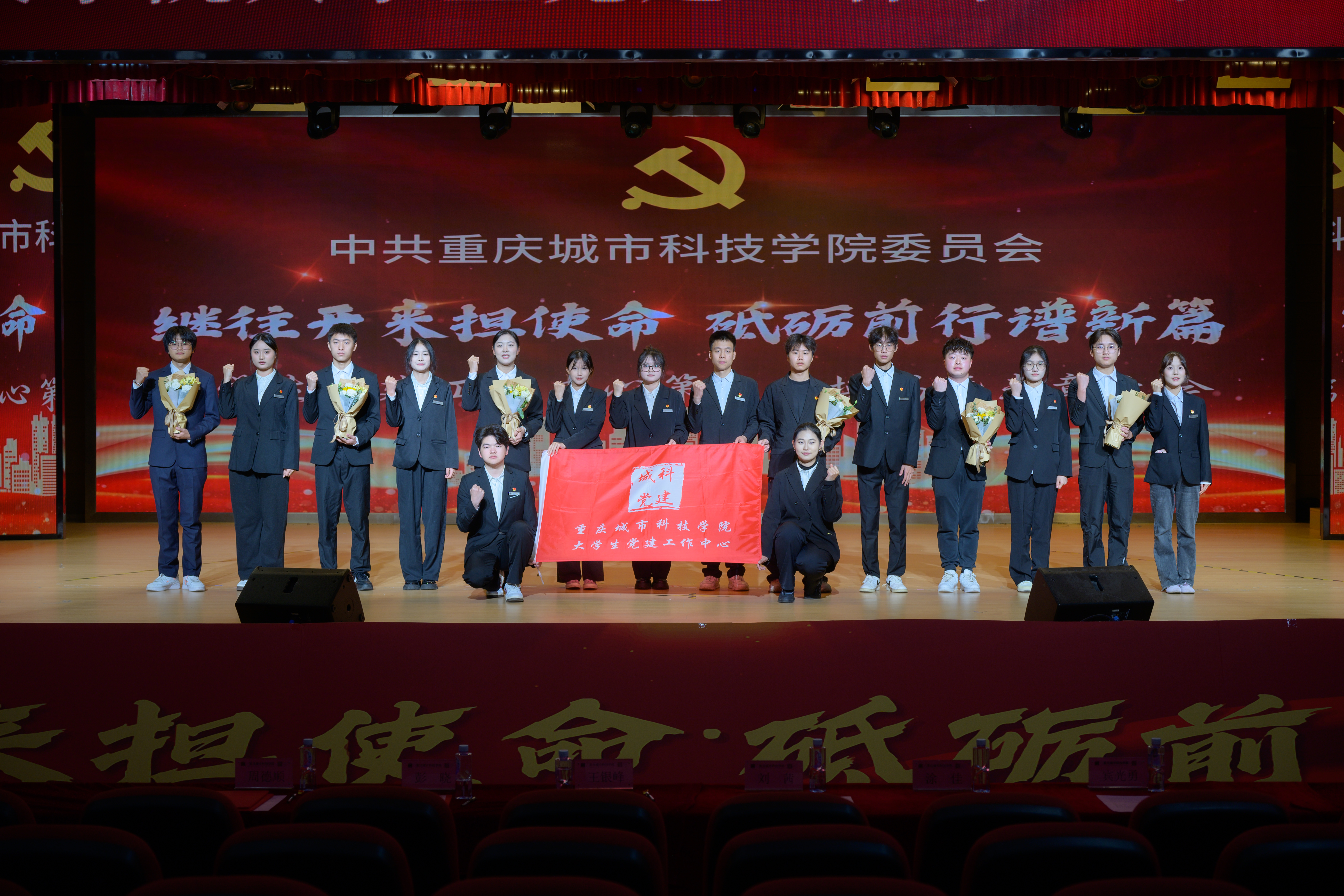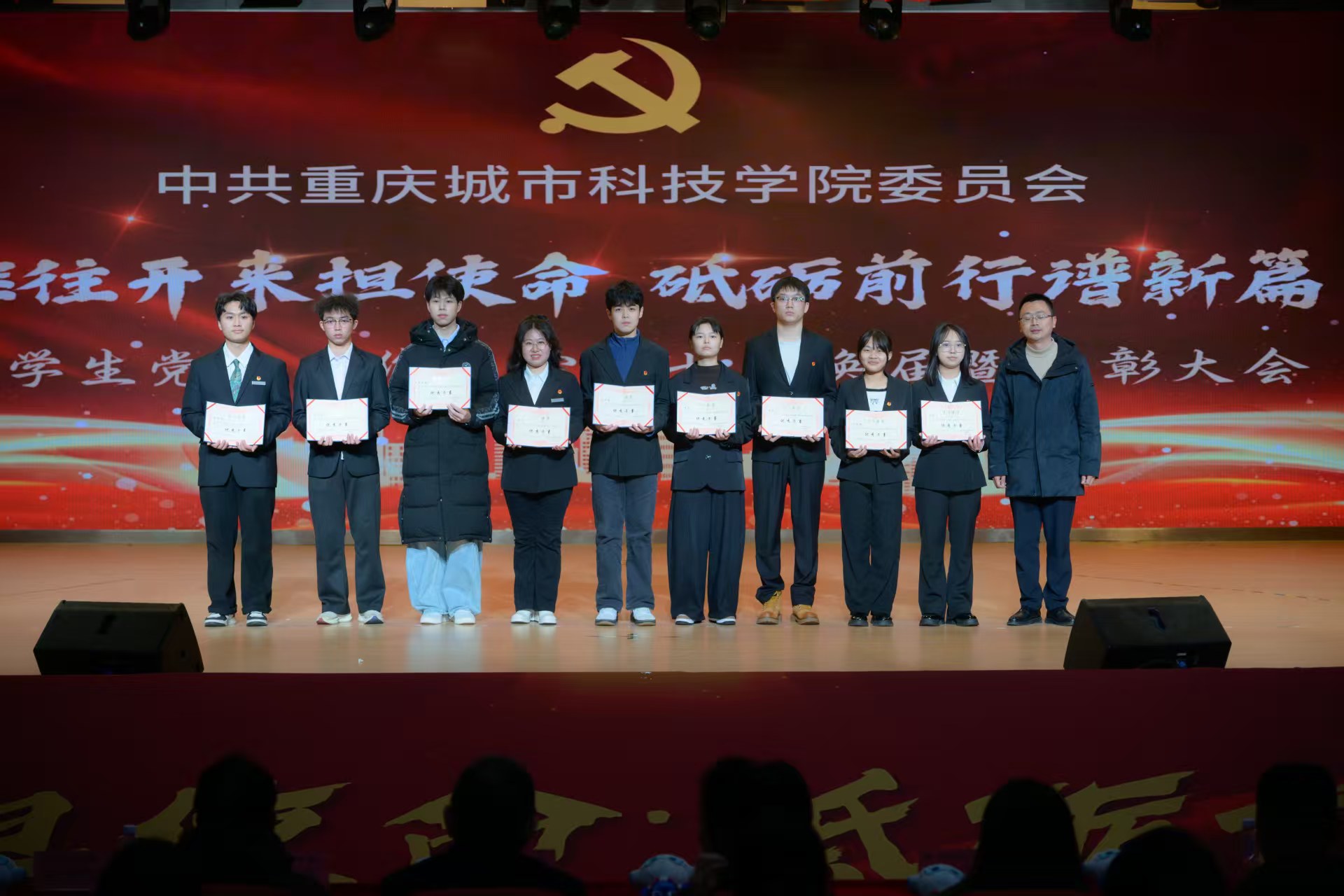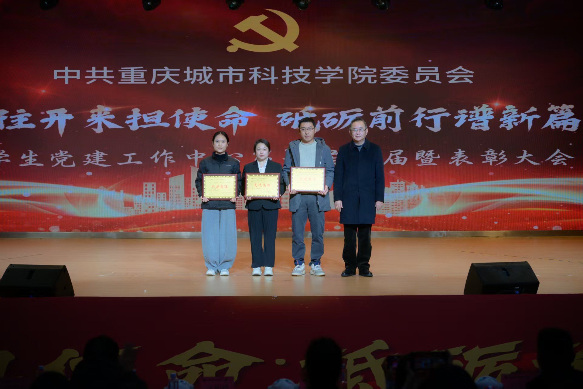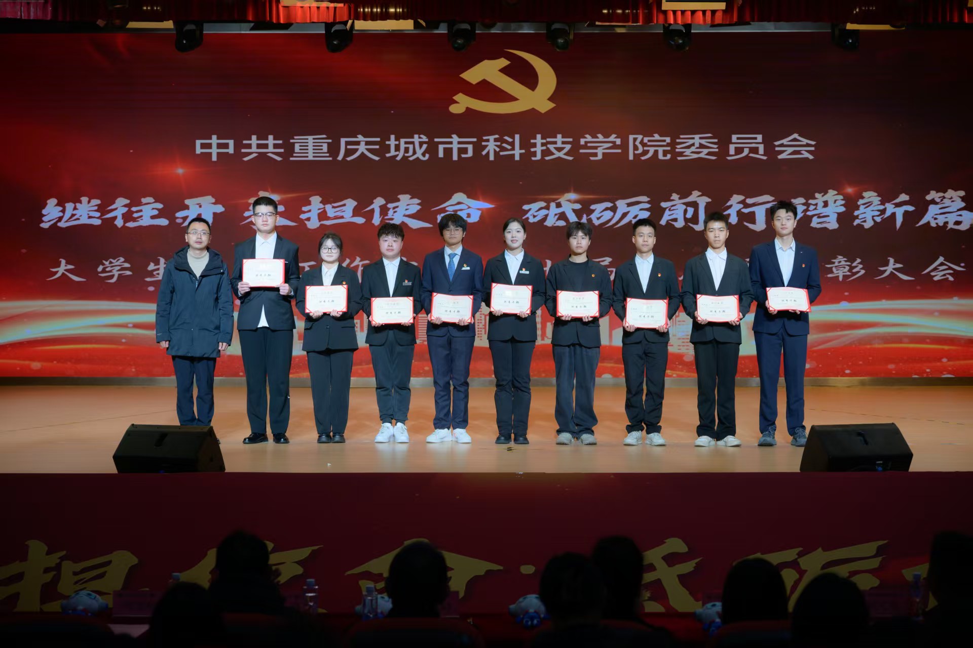 为进一步加强大学生党建工作中心队伍建设,传承红色基因,凝聚青春力量,确保工作平稳有序衔接、持续高效推进。2025年12月16日,beat365官方网站第七届大学生党建工作中心(以下简称中心)换届暨表彰大会于永川校区第一报告厅开展。学校党委书记、政府督导专员王银峰,学校党委宣传部部长彭晓,学校党委组织部部长刘茜,马克思主义学院党总支副书记涂佳,经济管理学院党总支副书记周德顺,艺术与传媒学院党总支副书记宾光勇,中心及各分中心指导老师,全体中心成员及各分中心学生代表参加本次大会。此次大会由张爽,李文博,曹溢淋,张晓雅主持。 第一篇章 薪火赓续 青春筑梦 一、奏唱《国歌》 大会伊始,全体起立奏唱《中华人民共和国国歌》 二、领导致辞 大会第二项议程,由党委宣传部部长彭晓为本次大会致辞,他勉励中心及各分中心成员,要以奋进之姿勇担时代使命,在城科的沃土上绽放青春芳华,向着崇高理想与奋斗目标笃定前行;要秉持实干笃行的精神,深耕学习与工作岗位,以创新实践赋能工作提质增效,切实履行服务中心发展的职责,真正做到以知促行、以行践知。 三、观看《2024-2025学年工作回顾》 四、第七届中心骨干代表发言 大会第四项议程,由第七届中心骨干代表韩贵川发言,他回顾了第七届中心成员在理论学习、实践服务、自身建设等方面的成果,分享了以坚守初心、服务师生、团队协作、创新实干为核心的经验。表达了对第八届成员的殷切期望,勉励新一届成员接续奋斗,为学校发展贡献力量,并送上了美好祝福。 五、为第七届中心骨干代表颁发聘书 随后,中心指导老师马煦玥为大学生党建工作中心第七届干部颁发聘书,一份份聘书,不仅是肩上的责任,更凝聚着对中心干部们辛勤付出的肯定与赞誉。 往昔耕耘结硕果,未来逐梦启新程。由衷祝贺大学生党建工作中心及全体成员过往所取得的优异成绩,也向他们的不懈努力与无私奉献致以诚挚的感谢。 六、宣读《2024-2025学年优秀工作 者的表彰文件》 大会第六项议程,由大学生党建工作中心指导老师冯梅宣读《2024-2025学年优秀工作者的表彰文件》。 七、为优秀工作者和先进集体颁奖 艺术与传媒学院党总支副书记 宾光勇 为学习标兵颁奖 艺术与传媒学院党总支副书记 宾光勇 为优秀干事颁奖 经济管理学院党总支副书记 周德顺 为优秀干事颁奖 经济管理学院党总支副书记 周德顺 为优秀干部颁奖 马克思主义学院党总支副书记 涂佳 为优秀干部颁奖 马克思主义学院党总支副书记 涂佳 为优秀部门颁奖 学校党委书记、政府督导专员 王银峰 为先进集体颁奖 八、节目《玉盘》 由中心成员带来的《玉盘》,《玉盘》传递着中华民族古今一脉的求索精神,彰显家国雄心与逐梦热忱,展示了传统与现代融合、童真与宏大共鸣的文化传承与时代力量。 第二篇章 初心如炬 再谱华章 九、宣读《新任干部任命文件》 大学生党建工作中心指导老师易建平宣读《新任干部任命文件》,一纸任命,承载使命;一份职责,凝聚担当。愿第八届大学生党建工作中心全体成员,承续初心、笃行不怠,共同书写中心发展的崭新篇章。 十、新老干部授牌仪式 随后,由第七届干部为第八届干部授予工作牌、交接中心旗帜。这一交一接,既传递着上一届全体成员的期盼,也意味着新一届干部正式扛起了中心的工作责任。 十一、观看第八届风采创意视频 十二、第八届中心骨干代表发言 大会第十二项议程。由第八届中心主任袁晓琴发言。袁晓琴同学代表全体中心成员庄严承诺,将始终坚守加入中心的初心使命,永葆对大学生党建工作的热忱,以高标准严格要求自我,持续精进学识本领,以乐观坚韧的态度直面挑战、勇克难关。 十三、情景剧《革命之精神》 紧接着,由体育大健康学院同学带来情景剧表演—《革命之精神》,革命烈士以“舍生取义”的信仰,畅想家国光明未来,诠释共产党人“道之所在,虽千万人吾往矣”的使命,传承革命精神。 十四、领导总结讲话 最后一项议程,由学校党委组织部部长刘茜为本次换届暨表彰大会作总结讲话。刘部长对本次大会的圆满成功表示热烈祝贺,向深耕学校党务工作一线的指导老师致以崇高敬意,并向接过重任的第八届成员送上诚挚祝贺与殷切期待。回顾2024-2025学年,第七届成员在思想引领、组织建设、实践服务等领域深耕实干,以每月“理论学习会”浸润青年思想,以严谨细致的态度落实各项工作任务,以丰富多样的活动凝聚青春力量,交出了一份亮眼的答卷。刘部长强调,换届是薪火相传的纽带,青年骨干要扛起时代重任,锚定新时代青年的使命任务与责任担当,立足青年思想特点创新工作形式,善用新媒体平台扩大工作覆盖面与影响力,以理想信念为帆,以实干担当为桨,为中华民族复兴贡献青春力量。 大学生党建工作中心第七届换届暨表彰大会圆满结束! 文稿来源:钟宏鑫 梁红梅 照片来源:罗婷 梁红梅 潘芊宇 郭雨欣 石运红 刘雯莉 唐铭尉 杨锦灿 视频来源:钟宏鑫 陈妍 唐啸 夏宇潇 陶嘉辉 阳雨杉 邓佳欣 石运红 编辑:朱江玲 阳雨杉 审核:党委组织部