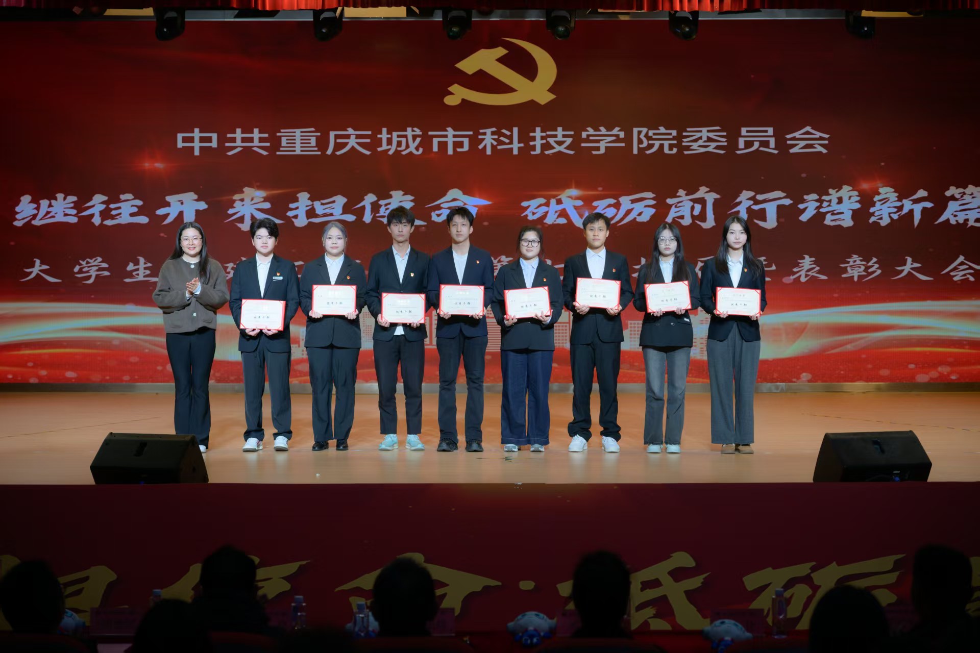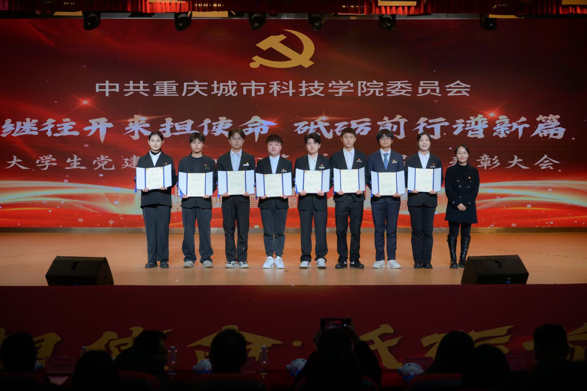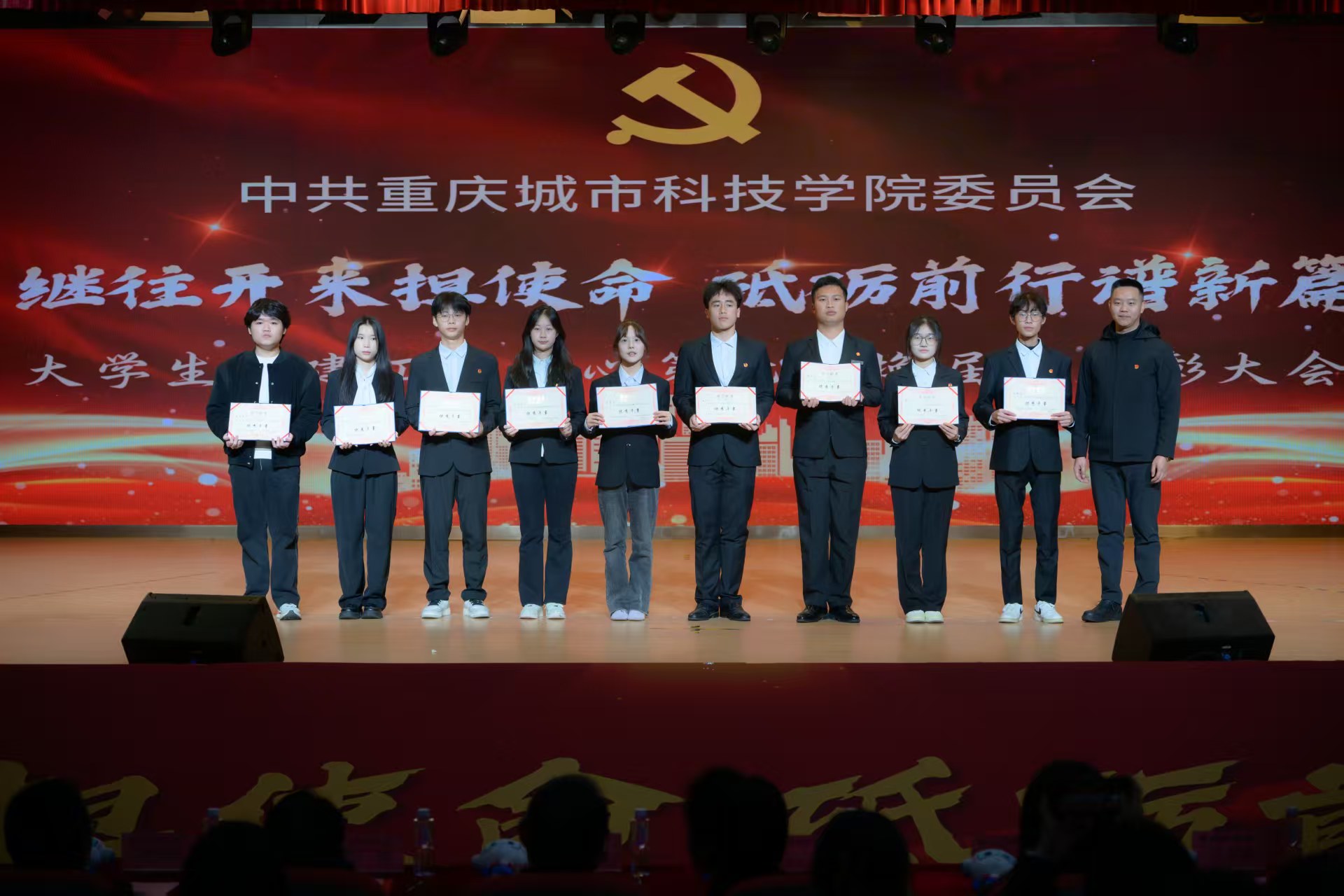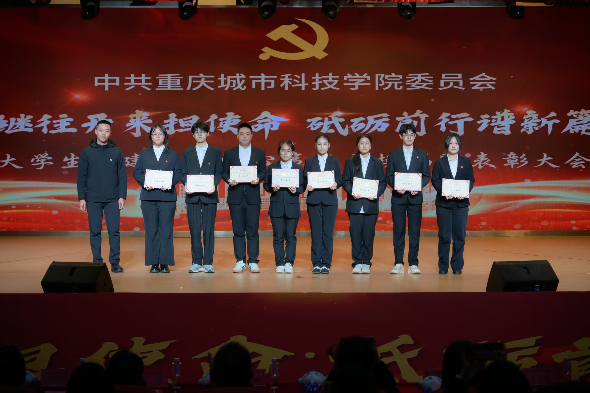 为进一步加强大学生党建工作中心队伍建设,传承红色基因,凝聚青春力量,确保工作平稳有序衔接、持续高效推进。2025年12月16日,beat365官方网站第七届大学生党建工作中心(以下简称中心)换届暨表彰大会于永川校区第一报告厅开展。学校党委书记、政府督导专员王银峰,学校党委宣传部部长彭晓,学校党委组织部部长刘茜,马克思主义学院党总支副书记涂佳,经济管理学院党总支副书记周德顺,艺术与传媒学院党总支副书记宾光勇,中心及各分中心指导老师,全体中心成员及各分中心学生代表参加本次大会。此次大会由张爽,李文博,曹溢淋,张晓雅主持。 第一篇章 薪火赓续 青春筑梦 一、奏唱《国歌》 大会伊始,全体起立奏唱《中华人民共和国国歌》 二、领导致辞 大会第二项议程,由党委宣传部部长彭晓为本次大会致辞,他勉励中心及各分中心成员,要以奋进之姿勇担时代使命,在城科的沃土上绽放青春芳华,向着崇高理想与奋斗目标笃定前行;要秉持实干笃行的精神,深耕学习与工作岗位,以创新实践赋能工作提质增效,切实履行服务中心发展的职责,真正做到以知促行、以行践知。 三、观看《2024-2025学年工作回顾》 四、第七届中心骨干代表发言 大会第四项议程,由第七届中心骨干代表韩贵川发言,他回顾了第七届中心成员在理论学习、实践服务、自身建设等方面的成果,分享了以坚守初心、服务师生、团队协作、创新实干为核心的经验。表达了对第八届成员的殷切期望,勉励新一届成员接续奋斗,为学校发展贡献力量,并送上了美好祝福。 五、为第七届中心骨干代表颁发聘书 随后,中心指导老师马煦玥为大学生党建工作中心第七届干部颁发聘书,一份份聘书,不仅是肩上的责任,更凝聚着对中心干部们辛勤付出的肯定与赞誉。 往昔耕耘结硕果,未来逐梦启新程。由衷祝贺大学生党建工作中心及全体成员过往所取得的优异成绩,也向他们的不懈努力与无私奉献致以诚挚的感谢。 六、宣读《2024-2025学年优秀工作 者的表彰文件》 大会第六项议程,由大学生党建工作中心指导老师冯梅宣读《2024-2025学年优秀工作者的表彰文件》。 七、为优秀工作者和先进集体颁奖 艺术与传媒学院党总支副书记 宾光勇 为学习标兵颁奖 艺术与传媒学院党总支副书记 宾光勇 为优秀干事颁奖 经济管理学院党总支副书记 周德顺 为优秀干事颁奖 经济管理学院党总支副书记 周德顺 为优秀干部颁奖 马克思主义学院党总支副书记 涂佳 为优秀干部颁奖 马克思主义学院党总支副书记 涂佳 为优秀部门颁奖 学校党委书记、政府督导专员 王银峰 为先进集体颁奖 八、节目《玉盘》 由中心成员带来的《玉盘》,《玉盘》传递着中华民族古今一脉的求索精神,彰显家国雄心与逐梦热忱,展示了传统与现代融合、童真与宏大共鸣的文化传承与时代力量。 第二篇章 初心如炬 再谱华章 九、宣读《新任干部任命文件》 大学生党建工作中心指导老师易建平宣读《新任干部任命文件》,一纸任命,承载使命;一份职责,凝聚担当。愿第八届大学生党建工作中心全体成员,承续初心、笃行不怠,共同书写中心发展的崭新篇章。 十、新老干部授牌仪式 随后,由第七届干部为第八届干部授予工作牌、交接中心旗帜。这一交一接,既传递着上一届全体成员的期盼,也意味着新一届干部正式扛起了中心的工作责任。 十一、观看第八届风采创意视频 十二、第八届中心骨干代表发言 大会第十二项议程。由第八届中心主任袁晓琴发言。袁晓琴同学代表全体中心成员庄严承诺,将始终坚守加入中心的初心使命,永葆对大学生党建工作的热忱,以高标准严格要求自我,持续精进学识本领,以乐观坚韧的态度直面挑战、勇克难关。 十三、情景剧《革命之精神》 紧接着,由体育大健康学院同学带来情景剧表演—《革命之精神》,革命烈士以“舍生取义”的信仰,畅想家国光明未来,诠释共产党人“道之所在,虽千万人吾往矣”的使命,传承革命精神。 十四、领导总结讲话 最后一项议程,由学校党委组织部部长刘茜为本次换届暨表彰大会作总结讲话。刘部长对本次大会的圆满成功表示热烈祝贺,向深耕学校党务工作一线的指导老师致以崇高敬意,并向接过重任的第八届成员送上诚挚祝贺与殷切期待。回顾2024-2025学年,第七届成员在思想引领、组织建设、实践服务等领域深耕实干,以每月“理论学习会”浸润青年思想,以严谨细致的态度落实各项工作任务,以丰富多样的活动凝聚青春力量,交出了一份亮眼的答卷。刘部长强调,换届是薪火相传的纽带,青年骨干要扛起时代重任,锚定新时代青年的使命任务与责任担当,立足青年思想特点创新工作形式,善用新媒体平台扩大工作覆盖面与影响力,以理想信念为帆,以实干担当为桨,为中华民族复兴贡献青春力量。 大学生党建工作中心第七届换届暨表彰大会圆满结束! 文稿来源:钟宏鑫 梁红梅 照片来源:罗婷 梁红梅 潘芊宇 郭雨欣 石运红 刘雯莉 唐铭尉 杨锦灿 视频来源:钟宏鑫 陈妍 唐啸 夏宇潇 陶嘉辉 阳雨杉 邓佳欣 石运红 编辑:朱江玲 阳雨杉 审核:党委组织部