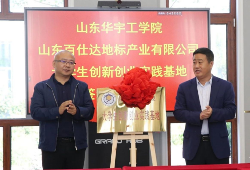 山东百仕达地标产业有限公司总经理曹成坤与校长助理魏东坡共同为大学生创新创业实践基地揭牌。