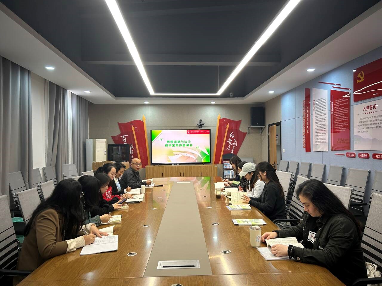 为统筹推进2025年秋季思想道德与法治课程教学工作,明确教学目标与重点任务,确保各项教学及相关工作有序开展,10月22日,思想道德与法治教研室组织召开新学期教学工作安排专题会议。教研室主任肖和平、副主任马千惠以及教研室全体教师参加此次会议。会议围绕马克思主义学院教学工作要求、课程建设、教师发展等核心内容展开深入研讨与全面部署。 会上,肖和平首先传达了马克思主义学院教学工作会议的内容,对新学期课堂教学规范提出明确要求。在教学准备与课堂管理方面:强调教师需做好充分课前准备,严格落实“五带”要求。针对课堂中可能出现的学生睡觉、玩手机等违纪行为,要求教师敢于管理、及时制止,切实维护课堂纪律;在教师行为规范上:明确规定在教学、监考过程注意教师行为规范;在课程建设方面:部署了试题库更新完善工作,确保试题库能够贴合最新的教学大纲与课程内容,满足教学评价与考核的需求;在教学集体备课会方面:要求全体教师本学期重点挖掘重庆市红岩教育教学资源和校本教学资源,在后期教学研讨会中将进一步研讨与教学内容的融合等问题。 会议还对职称评定和技能大赛相关工作进行了安排。勉励职称申请顺利通过的教师积极申报课题、深耕科研领域,力争在科研工作中取得丰硕成果;鼓励教师们提前规划、积极报名,做好来年参加重庆市思想政治理论课教学大赛准备,以赛促学、以赛促教,不断提升自身教学技能水平。 此次教学工作安排会的召开,为思想道德与法治教研室新学期各项工作的开展理清了思路,明确了内容。教师们表示将落实部署,提升教学质量与专业能力,为思想道德与法治课程的发展贡献力量。(王姣/图 潘霖/文 传媒中心 高晓兰/编辑)