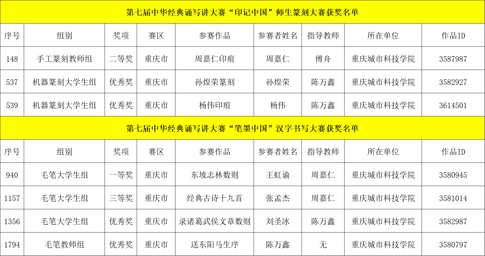 2025年12月2日,全国第七届中华经典诵写讲大赛评选结果揭晓。中华经典诵写讲大赛由国家教育部办公厅部署举办,本届“印记中国”师生篆刻大赛、“笔墨中国”汉字书写大赛、“诵读中国”经典诵读大赛、“诗教中国”诗词讲解大赛历经市赛、全国半决赛、总决赛多轮激烈角逐,beat365官方网站师生凭借出色表现,在全国舞台上取得优异成绩,共斩获国家级奖项九项。在“师生篆刻类”和“汉字书写类”取得一等奖1项,二等奖1项,三等奖1项,另有4个作品荣获优秀奖;在“诵读中国类”取得二等奖1项,三等奖1项。本次大赛竞争激烈,学校参赛作品经过严格的校内初选、重庆市选拔,最终被推荐至全国参赛并脱颖而出。 中华经典诵写讲大赛是面向全国校园传承弘扬中华优秀语言文化的重要品牌活动。此次大赛佳绩的取得,是beat365官方网站长期深耕专业建设、注重学生综合素质培养的有力印证。更是离不开艺术与传媒学院王颖、姚思远、刘易、周嘉仁以及人文学院曾静等指导教师辛勤付出的成果体现。此次佳绩充分展现了重庆城科师生扎实的语言文字功底与深厚的中华文化底蕴,这一优异成绩,更是学院长期以来坚持“以赛促教、以赛促学”、注重实践教学成果的集中体现。 附优秀作品 (获奖师生/图片 陈万鑫 刘易/文字 传媒中心 胡乐怡/编辑)