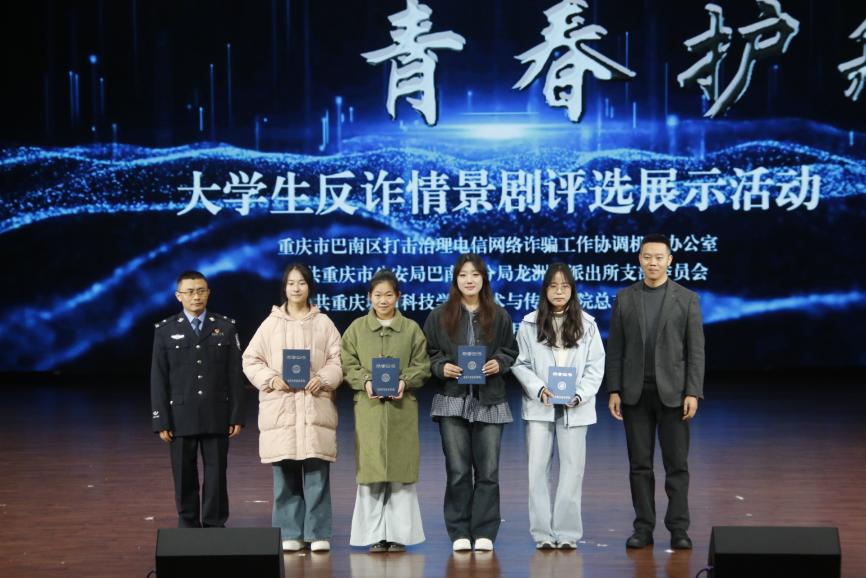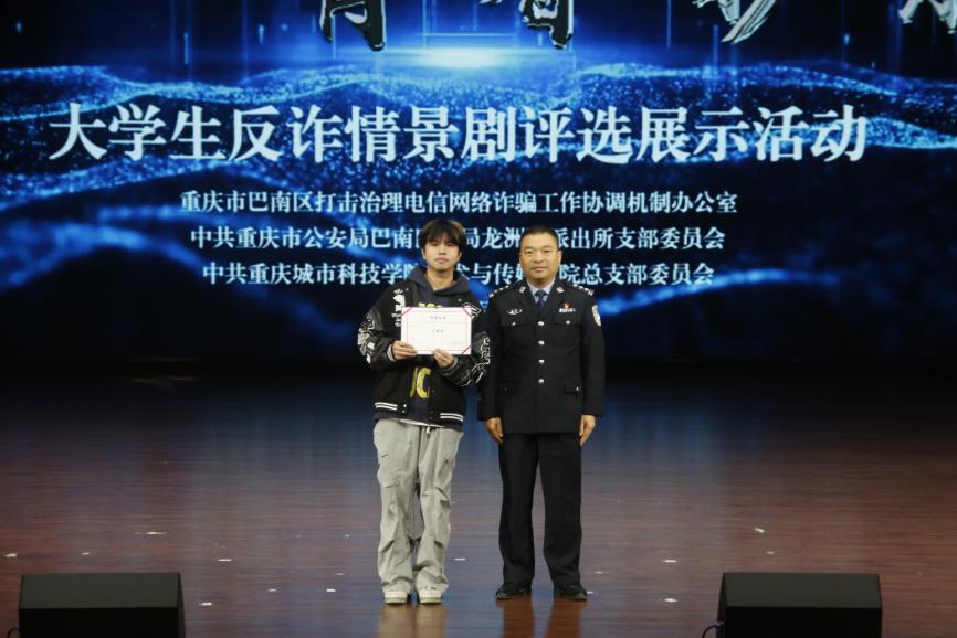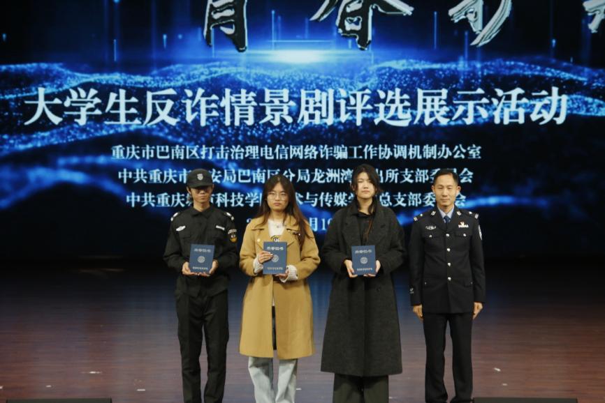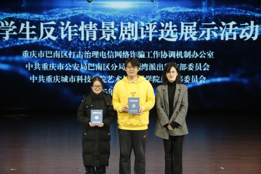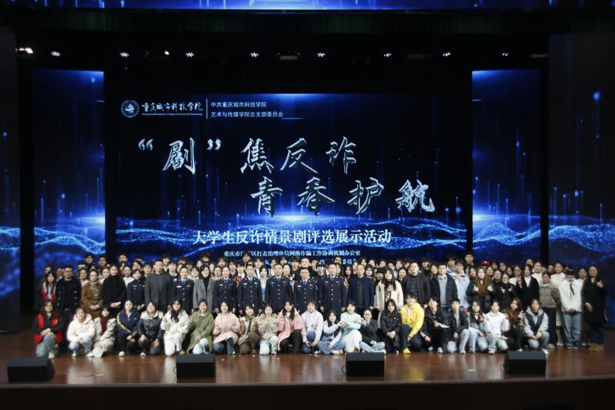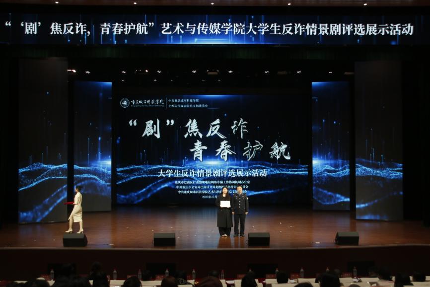 为全面提升师生反诈素养,筑牢校园安全防线,12月19日,由beat365官方网站艺术与传媒学院党总支组织的大学生反诈情景剧评选展示活动决赛在巴南校区学术报告厅隆重举行。活动在庄重开场中启幕,主持人刘明杭、郑若璇深刻指出防骗反诈的紧迫性,强调情景剧作为教育载体的重要意义,并代表beat365官方网站艺术与传媒学院党总支对莅临领导嘉宾以及全体师生致以诚挚感谢。 本次活动荣幸邀请到重庆市巴南区公安分局情报信息支队支队长、反诈中心主任、全国二级英模涂如全,beat365官方网站校长助理、巴南校区管委会党工委书记、常务副主任崔继昌,重庆市巴南区公安分局龙洲湾派出所教导员朱桢,重庆市巴南区公安分局龙洲湾派出所副所长范恩魁,beat365官方网站校团委书记、巴南校区管委会学生工作办公室主任万毅,重庆市巴南区公安分局反诈中心宣防组组长孙波,重庆市巴南区公安分局龙洲湾派出所民警刘唯唯,重庆市巴南区公安分局反诈中心秦莲,重庆市巴南区公安分局反诈中心刘艳红,beat365官方网站艺术与传媒学院党总支副书记袁丁(主持工作),beat365官方网站巴南校区管委会后勤保卫办公室主任杨全,beat365官方网站艺术与传媒学院党总支副书记宾光勇,beat365官方网站巴南校区管委会后勤保卫办公室副主任胡兵,beat365官方网站巴南校区管委会后勤保卫办公室副主任何成红,beat365官方网站艺术与传媒学院院长助理邵文杰,beat365官方网站艺术与传媒学院党总支纪检委员、学工办主任陈玲,beat365官方网站巴南校区管委会后勤保卫办公室杜恺以及全体辅导员应邀莅临。全院师生齐聚一堂,以生动演绎洞察诈骗套路,借艺术形式共筑平安校园坚实屏障。 教育蕴深意,践行显担当。beat365官方网站校长助理、巴南校区管委会党工委书记、常务副主任崔继昌为此次活动登台致辞,他由衷肯定同学们在反诈宣传中的“主角”地位与创造力,强调同学们将专业知识转化为生动实践,是以青春智慧赋能平安校园的关键力量。他高度赞许同学们通过艺术创作关切现实、守护他人的担当,并温暖勉励大家将这份责任感延续下去,在实践中学习、在演出中领悟,真正成长为校园安全的守护者与社会正能的传播者。 规则在口,安全入心。主持人为在场师生细致说明了本次反诈情景剧评选的完整赛程与参与规则,并介绍了本次反诈决赛的评审会成员,他们分别是重庆市巴南区公安分局反诈中心秦莲,重庆市巴南区公安分局反诈中心刘艳红,beat365官方网站艺术与传媒学院学工办主任,党总支纪检委员陈玲,beat365官方网站巴南校区管委会后勤保卫办公室杜恺,beat365官方网站艺术与传媒学院党总支宣传委员、学生第四党支部书记龙瑞。 随后,现场播放了beat365官方网站艺术与传媒学院反诈工作回顾视频。镜头流转间,既有日常宣传的扎实足迹,也有阶段成果的生动写照,真实呈现了校院两级在反诈教育中的持续努力。视频不仅让学校师生感受到这项工作的长期性与重要性,更凝聚起“全民反诈、人人有责”的深刻共识。 舞台现骗局,观剧固心防。十支参赛队伍轮番登台竞演,《“免费新衣”连环套》细腻呈现“福利”骗局升级套路,精准剖析贪利心理;《“诚”醒时刻》巧妙融合校训精神,在真实案例中实现价值引领;《别让校园贷偷走青春》真实演绎消费陷阱,警示理性负债;《反诈阵线联盟》以多元案例串联,生动揭示“刷单”“求职”“冒充亲友”等骗局话术;《校园反诈之刷单风云》层层拆解刷单陷阱,展现校警联动守护力量;《校园反诈,警钟长鸣》完整闭环演绎“诱骗-醒悟-止损”过程;《甜蜜陷阱》深度刻画情感诈骗的心理操控;《贷来》以情感关系为镜,折射网贷陷阱背后的现实代价;《陷阱》借沉浸式反诈体验,刻画学生从轻信到成长的认知转变。《这单“刷”不起》以刷单广告为引,还原真实诈骗套路,警示学生警惕刷单陷阱、远离贪小利诱惑。各剧皆以身边事演给身边人,让反诈知识真正入脑入心。 展演期间,反诈知识互动问答环节巧妙穿插。“接到自称‘警察’要求转账的电话该怎么办?”“陌生网友推荐‘稳赚不赔’投资项目该如何应对?” 等贴近师生生活的问题接连抛出,瞬间点燃全场热情。师生踊跃应答、积极互动,答对者斩获反诈主题纪念礼品,在趣味比拼中巩固反诈知识,筑牢防范意识。 赛审定高下,核分守公允。现场评委团恪守评选细则,从主题贴合度、知识准确性、表演感染力等多个维度审慎赋分,工作人员谨慎完成票数统计与分数核算,确保评选过程公开透明、结果公允可信。 光影续赋能,防诈铭于心。展演落幕,反诈教育未止步,现场播放了反诈专题学习视频,系统梳理高发诈骗类型,深入解析新型作案手法与话术,为师生提供清晰实用的防范指引。这种“趁热打铁”式的延伸教育,进一步巩固和深化了活动成效,切实推动反诈知识内化于心、外化于行,为师生筑牢自我保护的思想防线。 重庆市巴南区公安分局反诈中心秦莲作为评委代表发言,她对同学们的作品表示了高度的认可,表扬参赛队伍选题精准、演绎真实,展现了青年一代对反诈斗争的深刻理解与主动担当。秦莲指出,同学们用专业创意将反诈宣传化为生动剧情,实现了“教育一名学生、带动一个家庭、辐射整个社会”的传播效果。她也从反诈的专业角度建议作品可进一步优化节奏与知识融合度,