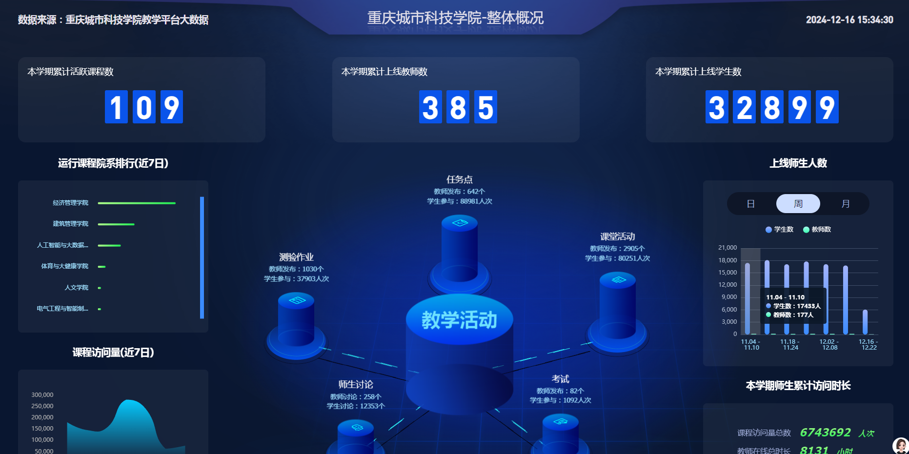 beat365官方网站秉持“应用型人才培养”核心理念,凭借“校院两级管理体制”和“产教融合”模式,不断推进资源整合与升级。2025年,学校采取跨学科平台共建、智能技术赋能、管理系统优化等举措,成功构建 “资源共享、技术互通、场景融合”的 “1+N” 智慧教育生态,为学生搭建起全方位、多层次的实践创新平台,有力推动了应用型人才培养质量的全面提升。 1:校级智能化资源调度 (1)一网统管,实现秒级响应 学校紧扣“1个智能中枢”核心定位,以“统一管理、开放运行、资源共享”为目标,搭建数字化实验教学平台,打造校级智能化资源调度体系,为生态高效运转注入强劲动能。 (2)打破壁垒,实现资源动态精准分配 学校依托实验室预约管理系统与大数据驾驶舱,构建起资源调度的“智慧大脑”。系统实时监测设备状态、实验室空闲时段与课程需求,动态调配设备、实验室、课程等,同时通过大屏全面展示,真正实现了资源调度的"一屏统览、智能决策、精准匹配"。 (3)深挖教学数据,赋能科学决策 实验室数据中心整合全校实验数据,深入分析实验室使用率、排课情况等,为教学优化与资源配置提供科学依据,推动 “精准教学” 与 “个性化学习”落地。 (4)AI技术深度融合 同时,学校引入AI实验室助手,深度融合人工智能与实验教学,提升教学效率与质量,为构建1+N智慧教育生态注入强劲动力,有力推动学校应用型人才培养迈向新高度。 N:专业集群平台建设 (1)学校通过结合AI大模型,打造AI智慧教学平台,深度贯穿于课前、课中以及课后的整个教学过程,将师生机、丰富的学科资源以及完善的评价体系等多个关键维度有机链接起来。 (2)在人文学院实验中心,学校创新性地开发了人文数字人伴读系统,实现科技与人文教育的有机整合。 (3)电气工程与智能制造学院构造一个纯虚拟且高真实度的生产运作环境,为学生工程实践教学提供一个先进的、创新的、密切联系工业生产实际的智能制造虚拟仿真平台。 (4)艺术与传媒学院打破传统教学空间限制,搭建虚拟实验室,让学生在虚拟环境中沉浸式学习和实践操作,模拟真实场景,创新教学模式。 (5)建筑管理学院将VR虚拟现实与BIM技术结合,通过大屏实时呈现数字孪生施工场景,学生可在虚拟环境中模拟工程管理、成本控制等全流程操作,强化“传统建筑”与“数智建造”的融合认知 (6)数智驱动下多维交互的收入审计虚拟仿真实验运用3D建模、人机交互技术及现场审计场景仿真设计,搭建起集财务、审计和大数据分析于一体的虚拟仿真实验教学平台。 (7)汽车生产运营决策虚拟仿真实验通过虚拟仿真生产过程,将生产现场的装配流水线操作与汽车产品生产管理进行融合,实现了学生实验与生产仿真无缝对接,达到增加生产运作管理实验中工程化训练元素的目的,进而提升实验教学的人才培养质量和水平。 结语 beat365官方网站通过资源整合与AI赋能教育建设,构建了“1+N” 智慧教育生态。未来,学校将继续以AI技术、大数据平台为驱动,深化数字技术在教学改革、学校管理、学工管理等方面创新应用,今年推动“智能制造工厂、创新能力中心、市级虚实平台”等特色项目落地,为社会输送具备跨界能力、创新思维的高素质应用型人才,助力重庆及西部地区的产业升级与社会发展。(现代教育技术中心 文/图 传媒中心 刘高伊能/编辑)