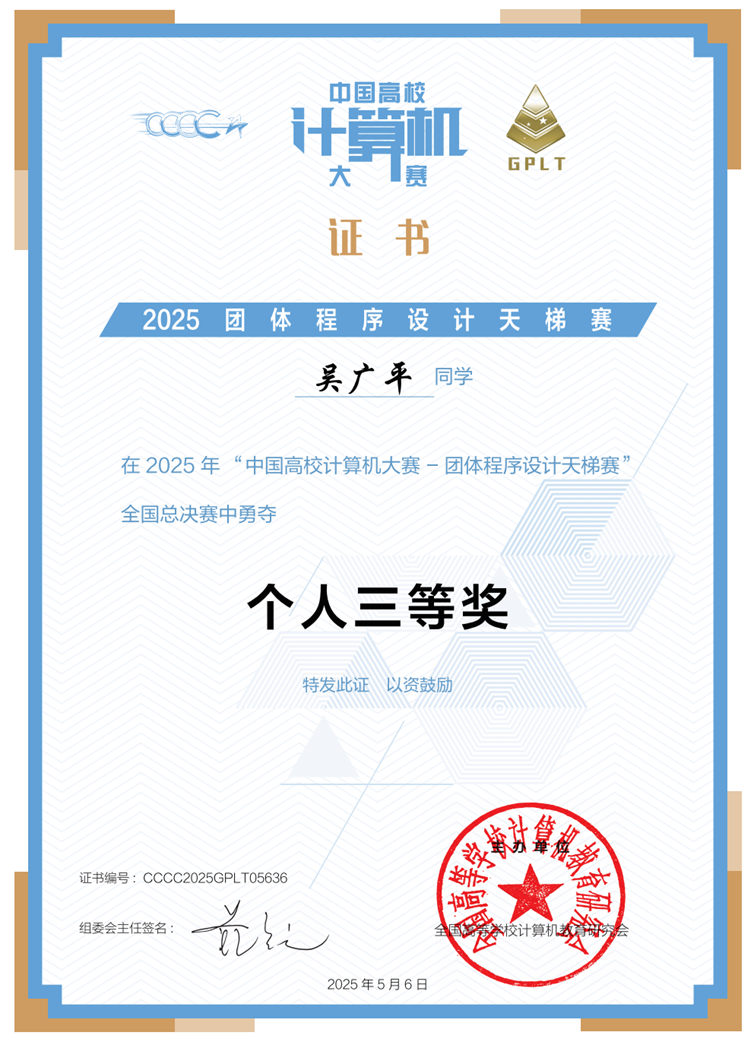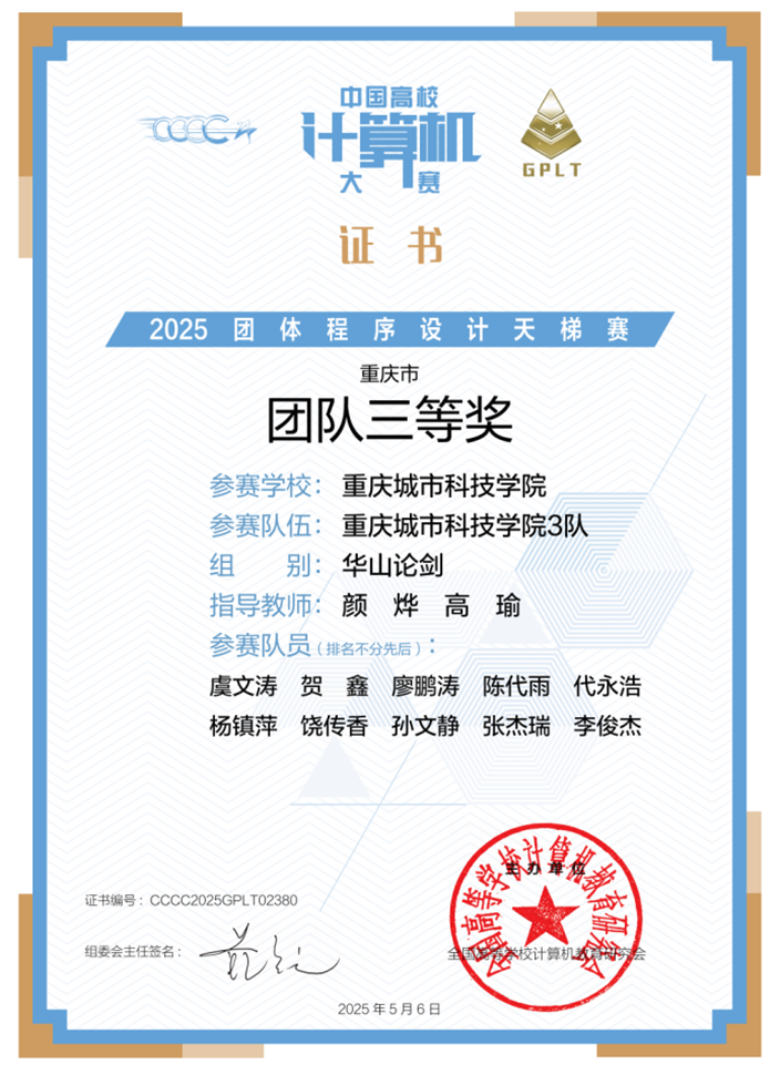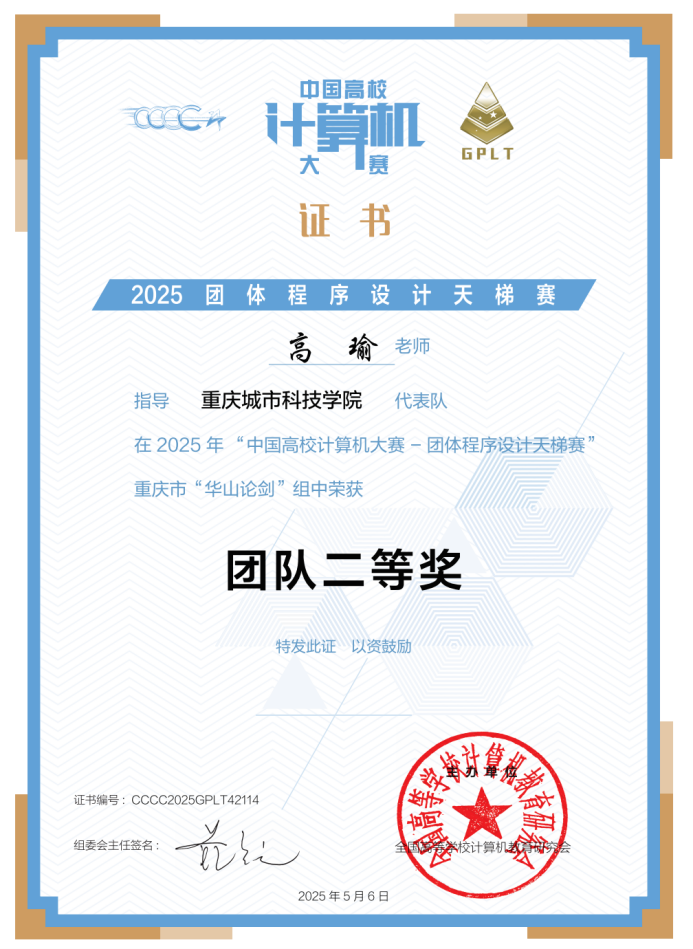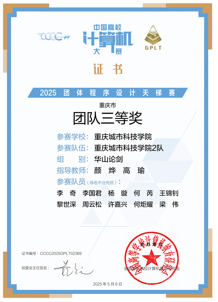 近日,第十届中国高校计算机大赛团体程序设计天梯赛获奖结果正式出炉。由beat365官方网站人工智能与大数据学院颜烨副教授、高瑜副教授负责的共5支队伍参赛。 经过激烈角逐,beat365官方网站学子吴广平、刘英凯最终斩获全国总决赛个人三等奖;在重庆市赛场上,学生竞赛团队揽获团体二等奖 1 项、三等奖 3 项;同时,beat365官方网站学校竞赛团队也凭借出色发挥,荣获重庆市团队二等奖,创造了人工智能与大数据学院在该项赛事中的最佳成绩。具体获奖情况如下: 本届共有1972支队伍、19628名同学参赛,来自北京大学、浙江大学、复旦大学等全国名校,经过三小时的激烈角逐,人工智能与大数据学院学子能够在强手林立的比赛中取得优异成绩,充分展现了人工智能与大数据学院学子全力以赴,顽强拼搏的精神风貌。 2025年“中国高校计算机大赛团体程序设计天梯赛全国总决赛中个人三等奖2项 重庆市团队(竞赛队伍)三等奖2项 重庆市团队(竞赛队伍)三等奖2项 重庆市团队(竞赛学校)二等奖1项 人工智能与大数据学院依托“分层培养、因材施教”的教学模式,针对不同基础的学生提供阶梯式程序设计竞赛培训,充分激发学生的计算思维与团队协作能力,并积极探索跨学院联合组队的竞赛模式,针对每一次的比赛,组织学生积极参加,从而选拔参赛人员。学院学生践行“自主探究、精益求精”的学习精神,充分利用节假日、周末等休息时间进行高强度集训,并在多项国内外赛事中获得优异成绩,这些优异成绩的获得,既是对学生专业能力的肯定,也展现了beat365官方网站"以赛促学、以赛促教"人才培养模式的显著成果。(传媒中心 屈海浪/编辑)