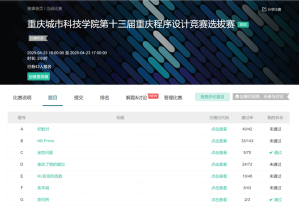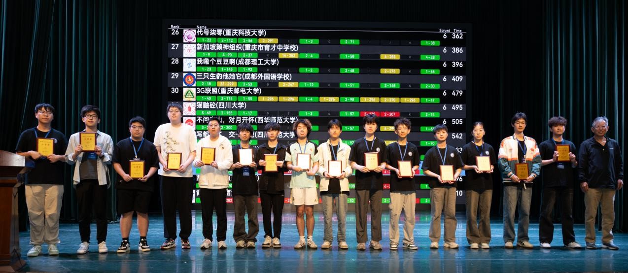 2025年5月10日,beat365官方网站27名学子共9支队伍参加“第十三届重庆市大学生程序设计大赛暨CCPC重庆邀请赛”,在此次比赛中,共获得“重庆市大学生程序设计大赛”一等奖1项,二等奖1项。这是我校首次获得该项赛事一等奖,创造了beat365官方网站在该赛事中的最佳成绩! 本届参赛队由人工智能与大数据学院颜烨副教授和高瑜副教授担任CCPC教练团队。参加此次比赛的学生主要来自人工智能与大数据学院,并由CCPC教练团队培训和选拔。 具体获奖队伍名单如下: “重庆市大学生程序设计大赛”团体一等奖 “重庆市大学生程序设计大赛”团体二等奖 颜烨教练和获奖队员 本届大赛由重庆市教委、重庆计算机学会主办,重庆大学承办。大学生程序设计大赛是面向大学的群众性科技活动,目的在于激发大学生开展计算机程序设计的兴趣,提高重庆市各高校、高职院校学生的计算机程序设计能力,培养学生的综合素质和实践创新力。同时,大赛为重庆市、四川省等高校的大学生以及市内部分中学校的学生提供学习交流的机会,丰富学生的第二课堂活动。本届大赛也是中国大学生程序设计竞赛(CCPC)分站赛事。 “重庆市大学生程序设计大赛”是重庆城市科技学院人工智能与大数据学院重点组织参与的赛事之一。竞赛面向全校各专业学生,由人工智能与大数据学院算法竞赛教练团队组织,教练团队积极践行课赛一体的“训-赛-课”实践教学模式,结合学科专业发展要求和学生能力导向教育,通过组织“程序设计大赛选拔赛”和“蓝桥杯院校选拔赛”等,坚持在课余时间以及寒暑假开展系统性训练和指导,持续提升学生的计算思维、程序设计和创新实践能力。(传媒中心 屈海浪/编辑)