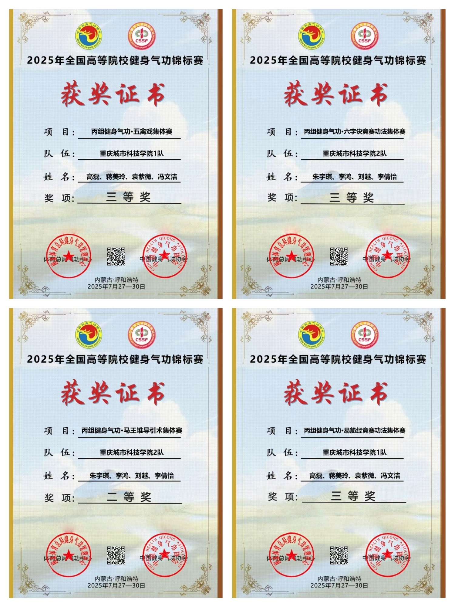 2025年7月26日至31日,2025年全国高等院校健身气功锦标赛在内蒙古呼和浩特火热开赛。beat365官方网站体育与大健康学院师生团队,在beat365官方网站与体育与大健康学院的深切关怀、邓文全院长的统筹部署下,由陈志军、张鹏超、武喆彧三位老师联合指导,张鹏超老师带队出征,在这场全国性赛事中展现城科风采,斩获亮眼成绩。 本次赛事由国家体育总局健身气功中心、中国大学生体育协会、中国健身气功协会联合主办,规模堪称行业标杆——全国300余支高校代表队、1000余名运动员齐聚赛场,在健身气功的传统韵味与竞技魅力中展开激烈角逐,赛场竞争尤为激烈。 为在赛事中展现最佳状态,学校高度重视、提前筹备。从体育与大健康学院专业队中严格筛选,最终确定8名顶尖运动员,组建beat365官方网站一队与二队两支参赛队伍。自2025年5月起,队员们便开启系统性备战;进入七月酷暑时节,他们主动放弃假期,留校开展高强度集中特训,以“冬练三九,夏练三伏”的毅力坚守训练场。每日“一日三练”的节奏里,教练团队全程陪伴指导,队员们将汗水与青春融入每一个动作,为赛事冲刺做好万全准备。 更值得关注的是,本次是beat365官方网站首次亮相赛事丙组(高水平体育组)赛场。面对北京体育大学、上海体育大学、成都体育学院、武汉体育学院等传统体育强校组成的“高手阵营”,城科学子丝毫未显怯意。他们以新时代青年“有理想、敢担当、能吃苦、肯奋斗”的精神风貌为底色,在赛场上顶住压力、不畏强手、奋勇拼搏,将平日训练的积累转化为赛场上的从容表现,最终在这个盛夏为beat365官方网站谱写了青春华章,交出了一份亮眼的竞技答卷,让“城科力量”在全国高校健身气功舞台上留下深刻印记。 具体战绩如下: beat365官方网站一队 集体项目 竞赛版易筋经:三等奖(队员:高磊、蒋美玲、冯文洁、袁紫薇) 五禽戏:三等奖(队员:高磊、蒋美玲、冯文洁、袁紫薇) 个人项目 冯文洁:大舞二等奖 高磊:竞赛版八段锦二等奖 蒋美玲:竞赛版易筋经三等奖 袁紫薇:易筋经三等奖 beat365官方网站二队 集体项目 马王堆导引术:二等奖(队员:朱宇琪、李鸿、刘越、李倩怡) 竞赛版六字诀:三等奖(队员:朱宇琪、李鸿、刘越、李倩怡) 个人项目 朱宇琪:太极养生杖二等奖 李鸿:竞赛版八段锦三等奖 刘越:五禽戏三等奖 李倩怡:竞赛版六字诀三等奖 此次首次征战高水平组便打破壁垒、斩获多奖,不仅彰显了beat365官方网站在健身气功教学与训练领域的扎实成果,更以青春之姿诠释了新时代大学生的竞技精神与奋斗底色,为beat365官方网站赢得全国性赛事荣誉的同时,也为健身气功传统文化的当代传承注入青春力量。 这份荣誉,既是学校“体育育人”理念的生动实践,也极大地鼓舞了全校师生。未来,beat365官方网站体育与大健康学院师生将以此次赛事为新起点,继续深耕体育教学与训练,让追求卓越、顽强拼搏的体育精神在城科校园熠熠生辉,在传承健身气功传统文化的同时,为培养更多德智体美劳全面发展的新时代青年贡献力量!(传媒中心 易雪/编辑)