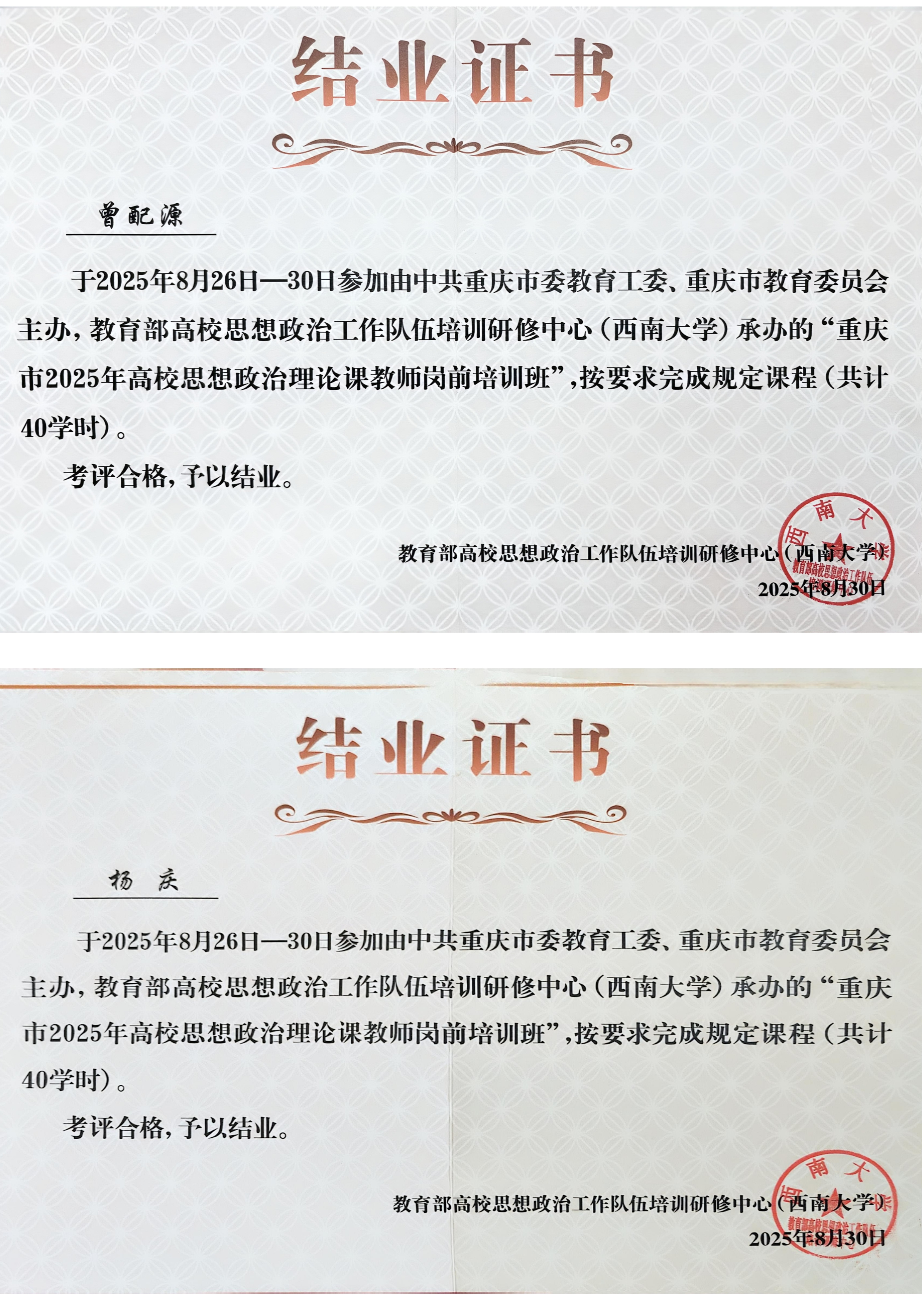 在教育改革与发展的关键时期,为深入学习贯彻习近平总书记关于学校思政课建设的重要讲话和指示精神,强化思政教育师资力量,提升高校思政课教学质量,推动新时代高校思政课高质量发展。2025年8月26日至8月30日,由中共重庆市委教育工委、重庆市教育委员会主办,教育部高校思想政治工作队伍培训研修中心承办的重庆市2025年高校思想政治理论课教师岗前培训在西南大学开班,马克思主义学院教师曾配源、杨庆参加学习。 本次培训采取专题报告和教学展示两种形式,数位专家学者开展授课,内容丰富多元,旨在帮助思政课教师深入理解党的创新理论,掌握前沿教学方法,更好地将思政教育与时代需求紧密结合。 在专题报告环节,中共重庆市委教育工委、市教委宣传处处长李林齐、西南大学原党委书记黄蓉生、四川大学马克思主义学院教授胡芳等专家,以《深入学习贯彻党的二十届三中全会精神 同步推进思政课建设与党的创新理论武装》《推动新时代高校思政课高质量发展的三大战略着力》《“习近平新时代中国特色社会主义思想”课程专题教学辅导》等为题,深入解读重要会议精神,指导教师将其融入教学,结合时代需求从教学内容、方法、师资等方面提出提升策略,助力提升新时代高校思政课质量。在教学展示环节,西南大学马克思主义学院副院长唐斌、重庆师范大学马克思主义学院教授兰桂萍等专家聚焦“习近平新时代中国特色社会主义思想概论”“毛泽东思想和中国特色社会主义理论体系概论”“马克思主义基本原理概论”“思想道德与法治”四门课程展开了内涵深刻、意蕴丰富的示范教学,凭借其深厚的专业素养和巧妙的教学设计,将抽象的理论生动化,展示了高质量的思政课堂范例。 培训期间,参训教师全身心投入专家学者高屋建瓴的专题报告和精彩纷呈的教学展示,认真学习,积极交流,收获颇丰。他们表示,此次培训所学,是责任亦是动力。未来,他们将以此次培训为契机,以深耕细作的态度,厚植思政教育根基,把党的创新理论融入课堂,用生动案例激活知识,以现代技术赋能教学,将所学所思转化为教学实践中的智慧与力量,用心用情用力培育时代新人,为铸就中华民族伟大复兴的中国梦源源不断输送有理想、敢担当、能吃苦、肯奋斗的栋梁之材。(马克思主义学院 图/文 传媒中心 谢秋雨/编辑)