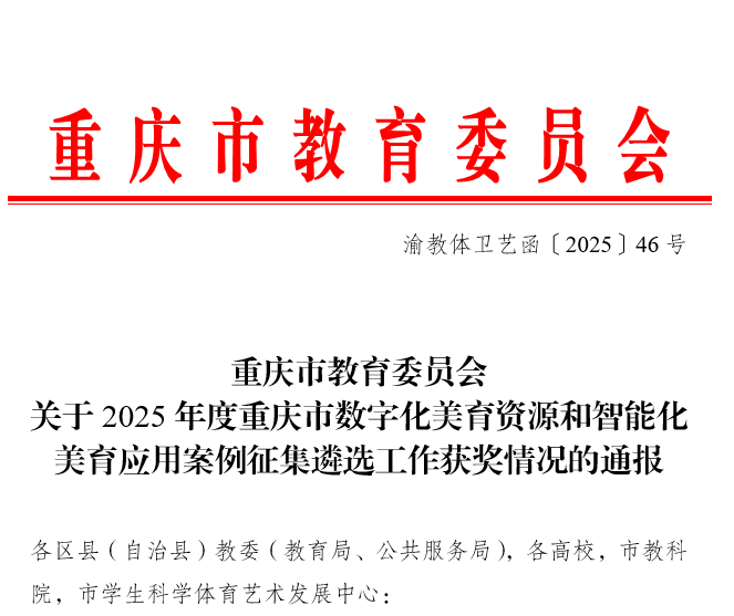 重庆市教育委员发布《关于2025年度重庆市数字化美育资源和智能化美育应用案例征集遴选工作获奖情况的通报》,探索数字技术赋能美育教学的创新路径。