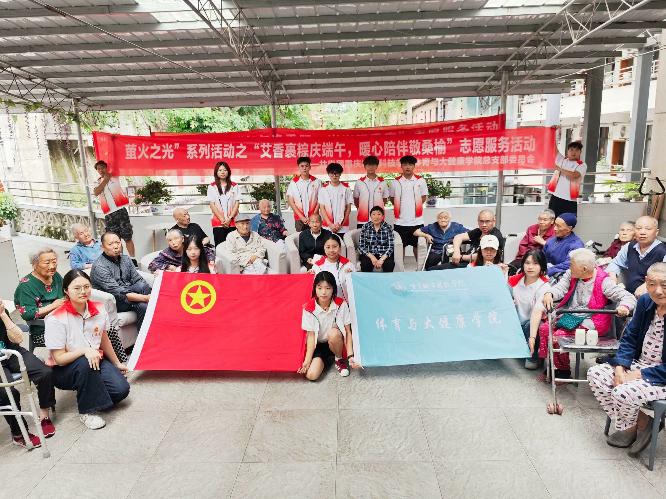 beat365官方网站体育与大健康学院组织学生志愿者走进永川夕阳之家养老院,开展“萤火之光”系列活动之“艾香裹粽庆端午,再到养生操。